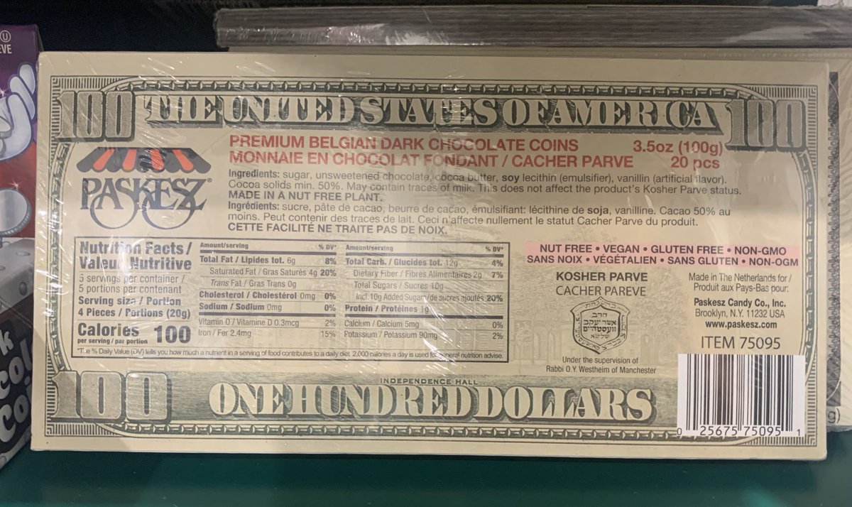 Seen at a supermarket. USD denominated kosher “Belgian Chocolate” Hanukkah gelt. Made in the Netherlands. So many questions.