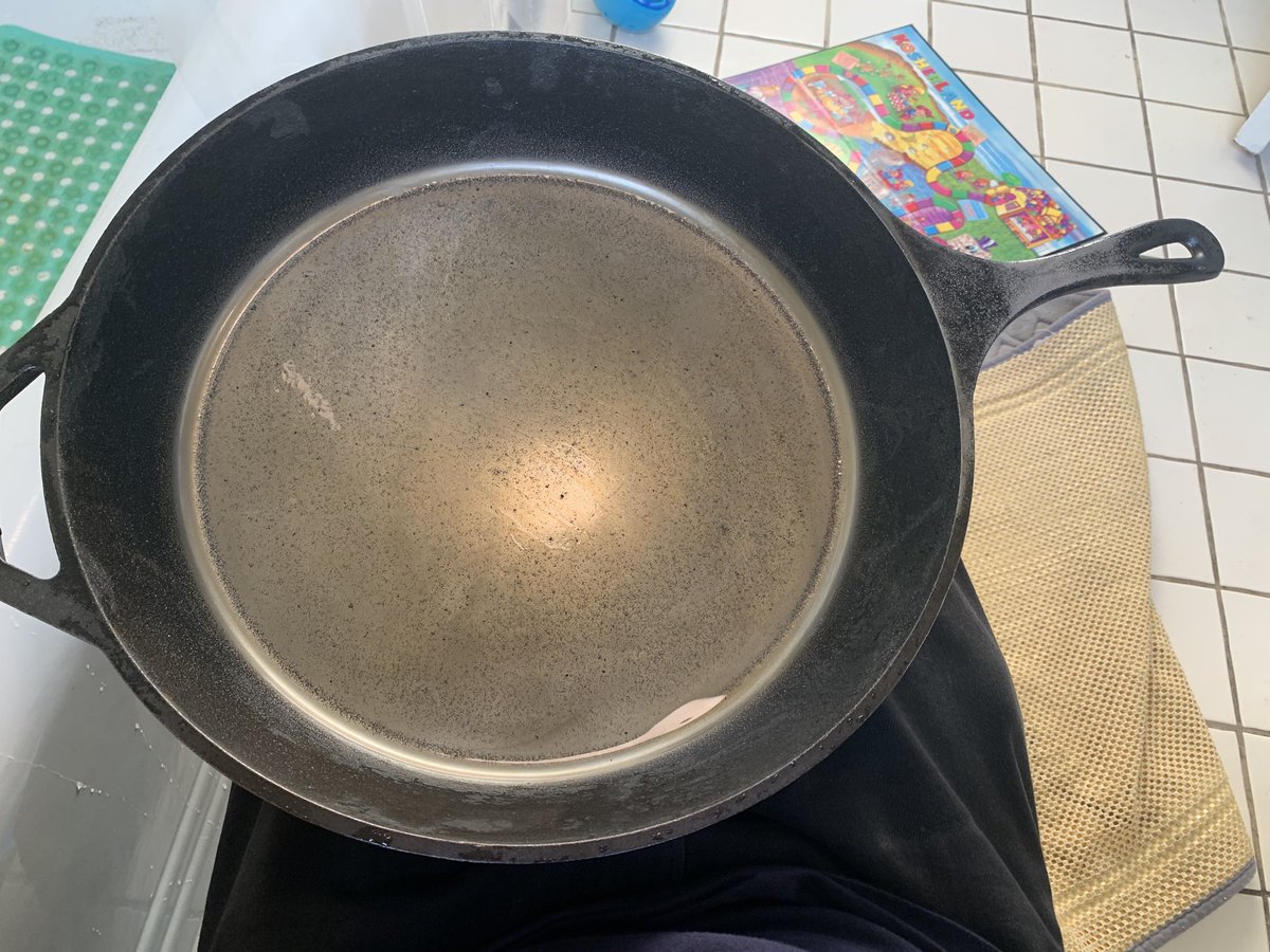 1. Bought a 15 inch Lodge skillet. Spent 2 1/2 hours with the orbital sander. In retrospect, I probably should have hit it a little bit harder, but hopefully it will be better enough to use after I season it.