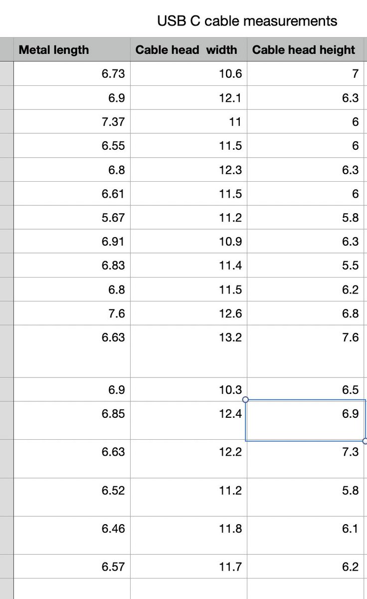 Apropos of nothing, a table of measurements of a selection of USB C cables found in my office.