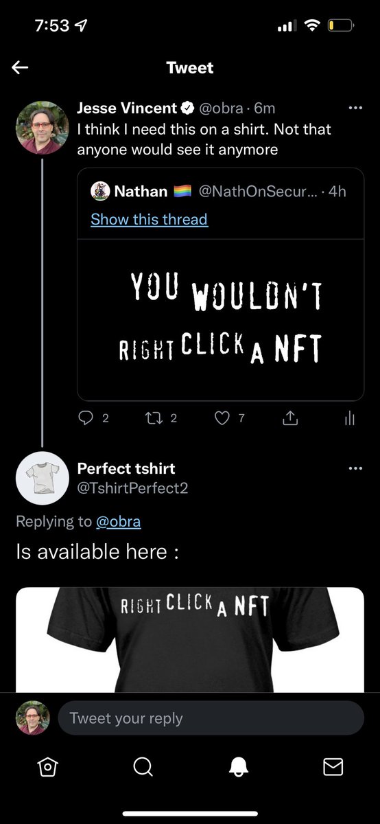 I can’t decide if I am impressed by this bot that creates throwaway Twitter accounts to shill custom T-shirts in replies or not.