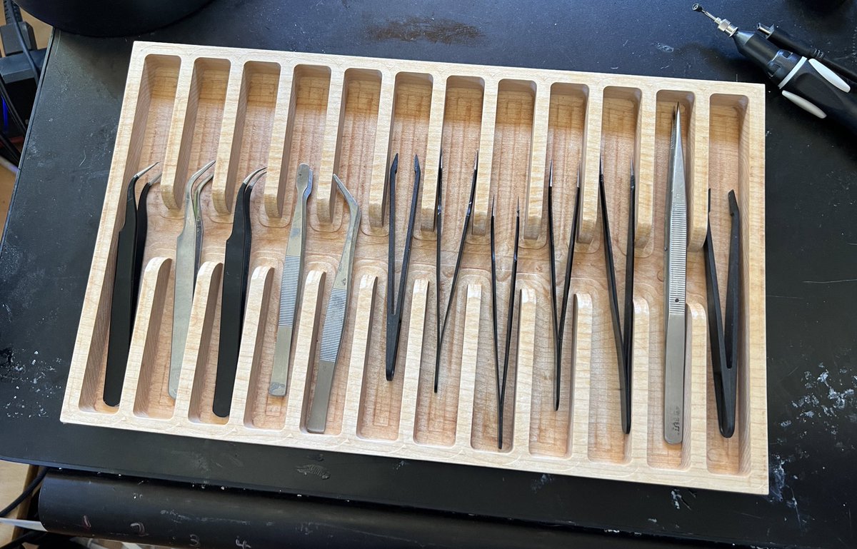 I tot tired of my tweezers having nowhere to live on the bench. It made a good excuse to fire up the CNC.
