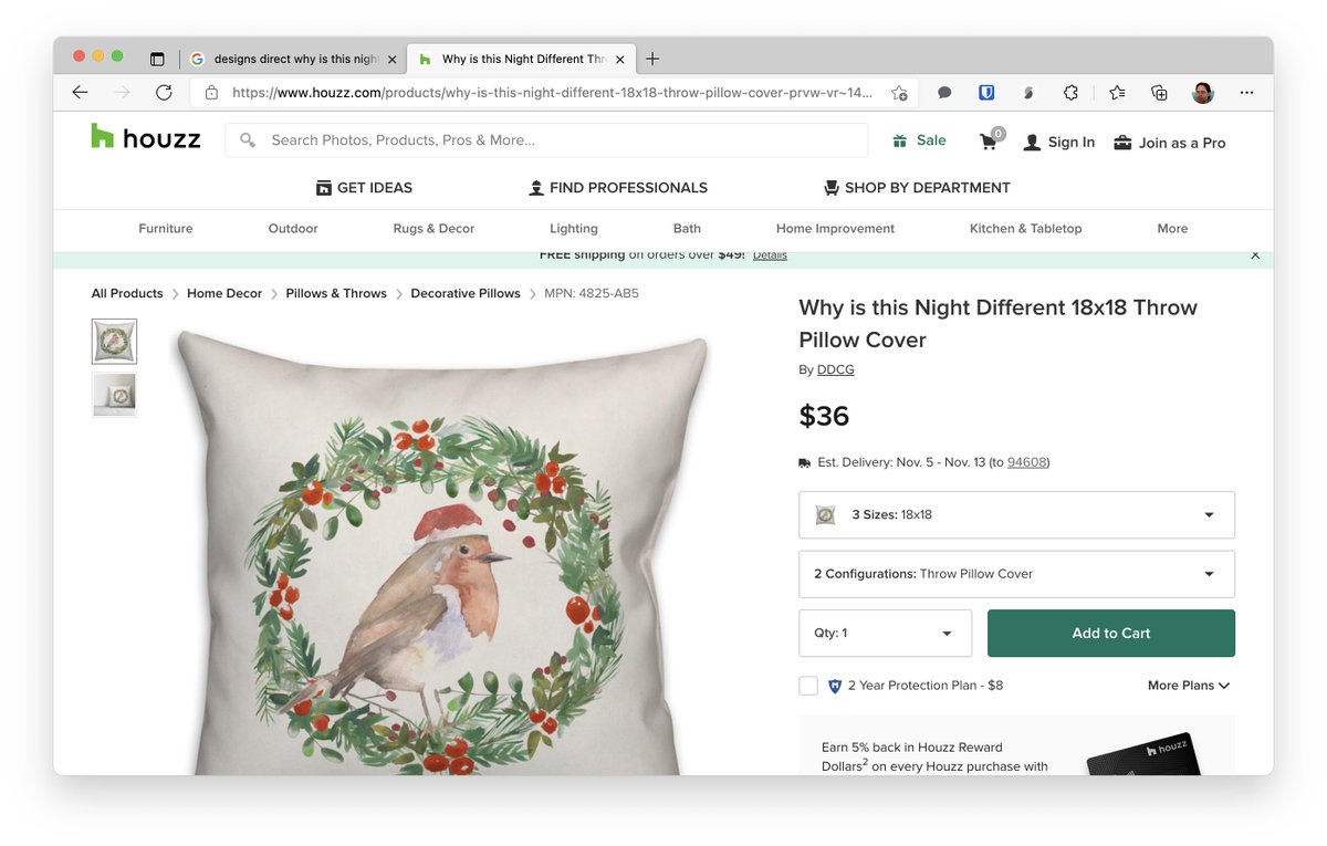 Sadly pulled from sale at BB&B. But still available at Houzz houzz.com/products/why-is-this-night-different-18x18-throw-pillow-prvw-vr~149343994 And it comes with this great Bird in a Santa Hat pillow cover