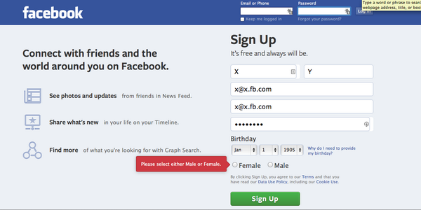 What happens if you try to sign up for Facebook without selecting Male or Female as your gender: