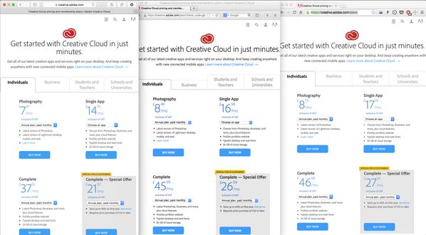 : Adobe changes its pricing depending on which browser you use. Wish I knew this awhile ago. ”