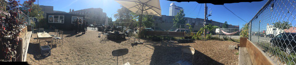 Most Oakland thing I've seen in Brooklyn: hip outside coffee bar with live DJ in empty lot with pews & a hammock