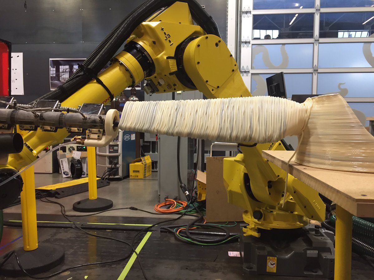 it is! Pellet-fed extruder, and able to print out of plane / on existing parts