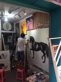 An artist in Dafen village painting a horse from a reference image on his phone.