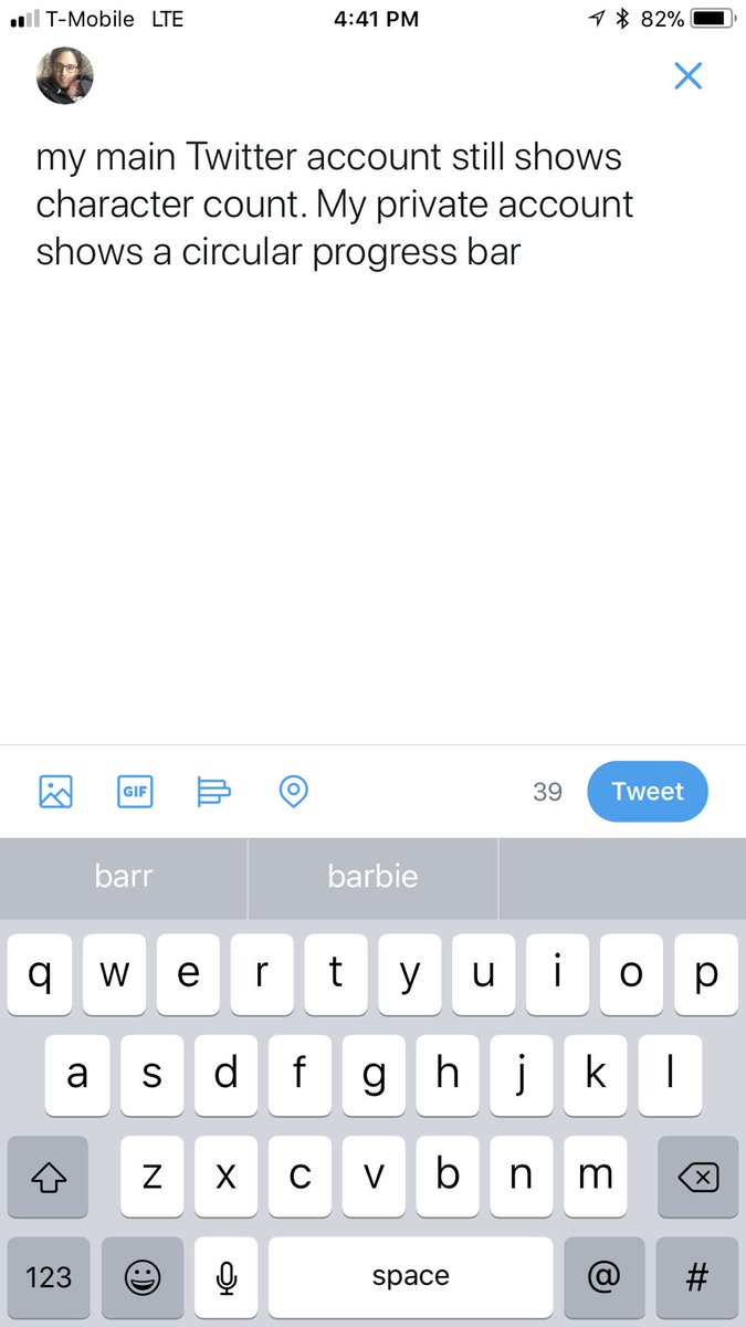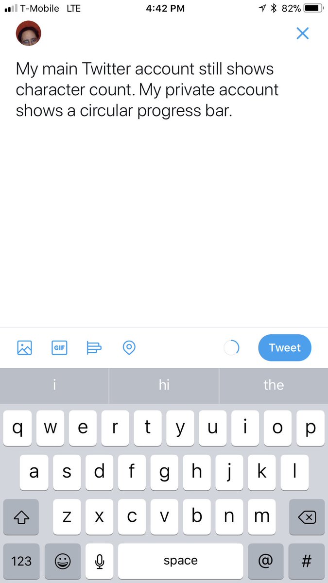 My main Twitter account still shows character count. My private account shows a circular progress bar. Hello A/B test!