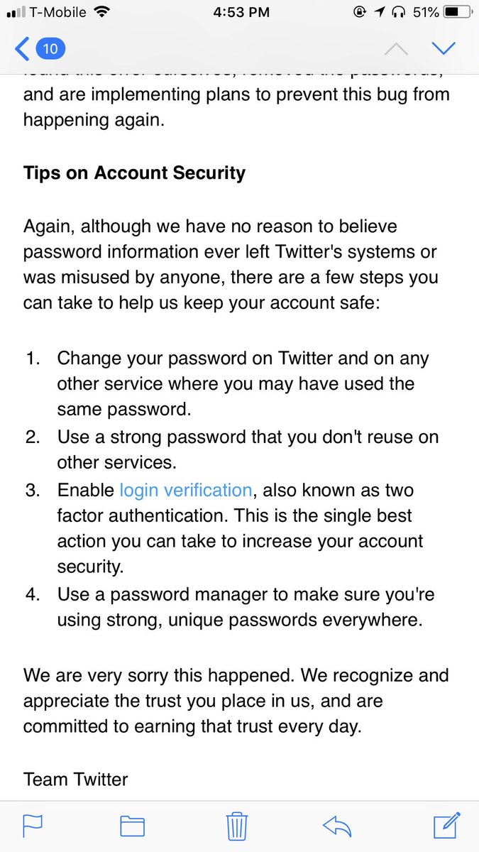 Apparently, Twitter was writing cleartext passwords to an internal log.